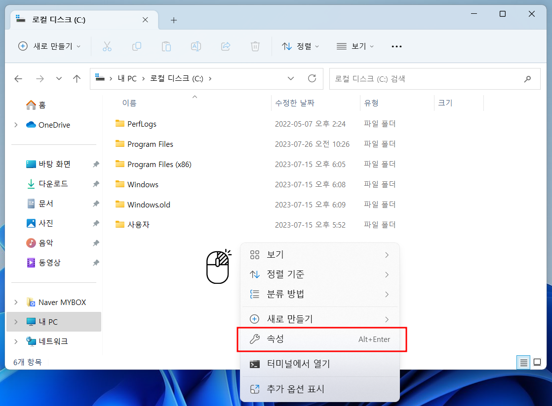 내 컴퓨터에서 C드라이브에 마우스 우클릭해서 속성에 들어갑니다. 또는 C드라이브 내에 마우스 우클릭으로 속성에 들어가도 됩니다.